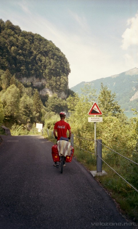 Rano zostaliśmy zaproszeni na śniadanie do rodziców naszego gospodarza (młody szwajcarski ser i dżem z moreli). Potem poszliśmy na Mszę św. po niemiecku. Wyjechaliśmy z Flums prosto na ścieżkę nr 9 Zaliczyliśmy kąpiel w Walensee, i ruszyliśmy wzdłuż jeziora. Droga rowerowa prowadziła wzdłuż autostrady, często zmieniając stronę nad- lub pod drogą. Trasa była przepiękna, najczęściej wiodła nad taflą jeziora. Po drodze mieliśmy okazję przejechać dwoma tunelami na ścieżce, tylko dla rowerzystów!!! Odcinek niedzielny, a zatem z założenia odpoczynkowy. Zrobiliśmy tylko jeden odpoczynek, w Rapperswill. W mieście zwiedziliśmy zamek, który do lat 50 XX wieku był polską własnością, a obecnie mieści się tam Muzeum Polskie. Zamek jest widoczny z każdego miejsca w mieście. Lekko znużeni upałem wykąpaliśmy się w Zurichsee – na jednej z nielicznych plaż w tej części jeziora. Nocleg znaleźliśmy w Meilen (właściwie przedmieścia Zurychu) po długim szukaniu. Wszyscy wysyłali nas na plażę, ale w końcu na samym końcu wsi, (albo na samej górze) dostaliśmy pozwolenie na rozbicie się na łące. Warto było podjechać. Namiot rozbijamy z cudownym widokiem na Alpy – wcześniej siedzieliśmy pół godziny i podziwialiśmy.
