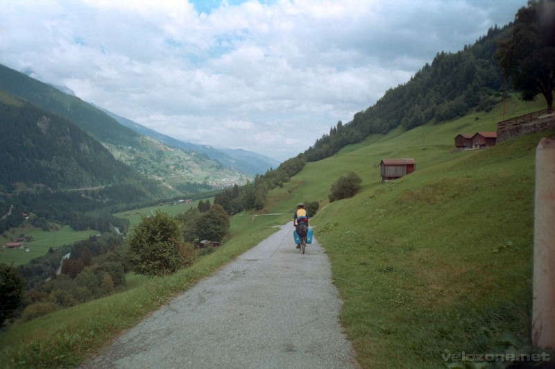 Wstajemy niewyspani o 7:30. Pogoda jest już troszkę lepsza. Długo się zbieramy po czym jedziemy na dworzec – najbliższa toaleta 🙂 – i do Coopa na zakupy. Na 1 km wjeżdżamy na drogę prowadzącą na Oberalp. Na początku 6 km serpentyn o średnim nachyleniu ponad 6%. Od czasu do czasu mijamy pociąg jadący wzdłuż serpentyn (!) – ludzie machają. Wyprzedził nas tylko 1 sakwiarz. Po serpentynach długa, prawie płaska prosta, jezioro i przełęcz. Zjazd miał 20 km, wymagał dużej koncentracji. Najpierw serpentyny i dobra, szeroka droga, potem trochę bardziej wąsko, brak barierek i przepaść. Widoki piękne, ale trzeba się skupić na jeździe. Za Disentis robimy postój, a potem… podjazd. Niestety dno doliny było na tyle niedostępne, że trzeba było jechać zboczami, to w górę to w dół. ścieżka przypominała nam o Beskidach – prawie tak samo ziemna, wąska, kamienista i kręta. Zjeżdżamy do Ilanz. Kolejne zakupy, posiłek i ruszamy dalej … pod górę (przypominam! jedziemy w dół doliny!). Jest trochę ciężko, zaczyna świecić słońce. Nic nie zapowiada… po serpentynach wyjeżdżamy na most nad rzeką. …przełom Renu… Fantastyczne skały, rzeka i wszystko widziane ze znacznej wysokości, cud miód. Potem nieoświetlony tunel, kilka remontów dróg – cały czas kilkadziesiąt metrów nad przełomem i dojeżdżamy do Bonaduz (długim, prostym zjazdem). Tam wjeżdżamy na rowerową 6-kę i dojeżdżamy do Pratvalu, gdzie pewna starsza pani najpierw ściąga nas do siebie wzrokiem, potem na pytanie o miejsce pod namiot odpowiada – możecie spać w pokoju, nie płacicie nic. Dostaliśmy pokój z dwoma łóżkami, kąpiel, gigantyczną kolację, deser, śniadanie na 8:00, czekolady na drogę i … 20 CHF.
