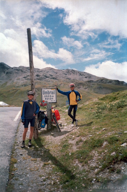 Budzi nas raz po raz deszcz. O 5.00 już nie śpimy, obydwoje nie możemy przestać myśleć, że już dzisiaj wjedziemy na Stelvio – zaczynamy się zbierać. Dziwi nas sąsiad gospodarza, który przynosi nam do namiotu kawę, a potem proponuje wysłanie maila. W efekcie wyjeżdżamy dopiero o 10:00. Od pierwszych metrów zaczyna się podjazd pod Umbrail. Jedzie się rewelacyjnie, mimo iż podjazd jest ciężki. Pierwsze 4 km to serpentyny, które bardzo kręto wspinają się po zboczu. Potem okazało się, że jest fragment bardziej płaski, ale za to droga była nieasfaltowa na odcinku 2-3 km. Na 6 km zaczęły się solidne serpentyny, które zaprowadziły nas powoli i mozolnie na Umbrail. Z przełęczy widać już Passo Dello Stelvio – cel naszej wyprawy. Chwila zjazdu do punktu granicznego, gdzie zaskakuje nas brak jakiegokolwiek celnika i zabite dechami budynki celne. Ostatnie 3 km podjazdu są dość męczące, mimo wszystko podjazd pod Umbrail dał się we znaki. Ale za to pojawia się „dziura w niebie” – widać kawałek błękitnego nieba. Jeszcze ostatnie metry i jesteśmy. Na szczycie atmosfera piknikowa a la nasze Krupówki i troszkę źle się tam czujemy. Jakiś Niemiec pyta, czy może sobie zrobić zdjęcie z naszymi rowerami. Ktoś stwierdza, że nie wie czy na wierzyć, że sami tu wjechaliśmy, ale i tak nam gratuluje. Małe zakupy pamiątek i jazda w dół. Tymczasem zaczyna padać śnieg. No cóż w końcu jesteśmy na 2758 m n.p.m. Zjazd zapowiada się imponująco, tymczasem… bardzo ostre serpentyny, fatalny asfalt, przenikliwe zimno powodują że zjazd nie należy do najprzyjemniejszych. Pod koniec zakrętów marzną mi (Łukasz) dłonie że trzeba je rozmasować. Dopiero pod koniec serpentyn (48 tornanti) pokazuje się lepszy zjazd – dojeżdżamy aż do Prato Di Stelvio. Tam okazuje się, że do Merano nie dojedziemy tego dnia, bo jest 41 km od nas, a jest już 17:00. Robimy zakupy, pierwsze we Włoszech i jedziemy w stronę Merano wzdłuż sadów z milionami jabłek. Aha, po tej stronie Stelvio jest świetna pogoda i świeci słońce… Nocleg (Tomek jak zwykle miał nosa) znajdujemy u sympatycznych Włochów, mówiących po niemiecku. Dostajemy pole, wannę i zaproszenie na kawę rano. Łukasz bawi się z psem gospodarzy – Fuxi, a Tomek próbuje nauczyć paru słów po polsku ich syna, bez skutku. Noc jest rewelacyjna – śpi się dobrze i wreszcie namiot jest suchy.