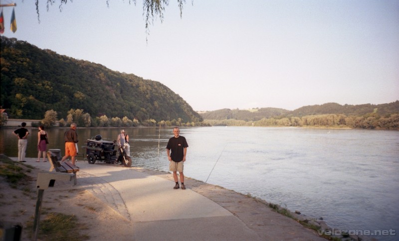 No i zaczyna się ostatni dzień w Czechach. Początkowo jazda przez góry jest znośna, ale za wsią Brloh zaczynają się „rzeźnie”. Jeden, drugi, trzeci podjazd, prawie każdy ma miejscami ponad 10%. Podjeżdżamy, podjeżdżamy, i po pewnym czasie nie dziwi nas, że jesteśmy w Kristanovicach – na wysokości ponad 900 m. n.p.m. Wynagradzają nam trochę górskie widoki. Na szczęście każdy podjazd prędzej czy później kończy się zjazdem 🙂 Po kilkunastu kilometrach pojawia się znak mówiący, że do Volar, miasta przed granicą droga jest zamknięta. Z mapy wynika, że objazd miałby jakieś minimum 40 kilometrów, więc niewiele się zastanawiając ruszamy zamkniętą drogą. Na całej długości (ponad 10 km) jest położony nowiutki asfalt. Jak się okazuje, nie mieliśmy żadnych problemów z przejechaniem, gładziutki asfalt, ani jednego samochodu, i tylko w jednym miejscu dziwnie patrzyli się na nas pracownicy budowlani. Po drodze mijamy źródełko, i za chwilę po odjeździe musimy pojawić się przy nim ponownie, bo Tomek zostawia bidony. W Volarach robimy ostatnie zakupy za korony i w drogę do Niemiec. Aha, trochę dziwne jest to, że większość samochodów, które nas mijają, jest na rejestracjach nie niemieckich, ani czeskich a… holenderskich! Jakiś masowy exodus Holendrów, czy co? :-)Czesi musieli wydać chyba dobry przewodnik po kraju w tym języku…. Atmosfera robi się nieco gęsta i przygnębiająca, przez kilka kilometrów towarzyszą nam przydrożne stragany, brud, i bezzębne prostytutki wzdłuż drogi, które na dodatek do nas machają. Brrr… Na granicy Tomek zdaje egzamin z języka na bdb. Celnik wypytuje dokładnie o cel podróży, życzy powodzenia, i jedziemy dalej. Jeszcze troszeczkę podjazdu, a potem 8 km, które pokonujemy świetnym zjazdem w 20 minut. Zatrzymujemy się na postój w Freyung. Dalej decydujemy, że skoro mamy dwa dni w zapasie (do Biel w Szwajcarii mamy dojechać dopiero 10 sierpnia) to może warto zobaczyć Passau. Jak się okazuje – nasza decyzja jest słuszna. Do Passau jedziemy główną drogą, troszkę przeszkadza ruch, ale za to jest cały czas z górki. W 1 h 35 minut pokonujemy 40 km dzielące nas od Passau. Tam decydujemy zanocować po raz pierwszy na campingu. Jak wielkie jest nasze zdziwienie, gdy okazuje się, że camping prowadzą… Polacy. Na campingu świetna atmosfera, prawie sami turyści rowerowi. Oczywiście wszystkie rowery zostają na noc na zewnątrz, i nikt nawet nie myśli żeby je kraść… Wieczorem zwiedzamy śliczne stare miasto oraz miejsce, gdzie Inn wpada do Dunaju. Wieczorem, gdy myjemy menażki (pamiętające czasy rodziców) jakiś Węgier pyta nas, czy jesteśmy Polakami. Zapytany, skąd wie, pokazuje na menażki i mówi, że ma takie same – kupił 20 lat temu w Warszawie. Po chwili rozmowy kończy łamaną polszczyzną: „Polak – Węgier dwa bratanki i do bitki i do szklanki”. Robi się niemal rodzinnie. 🙂