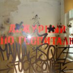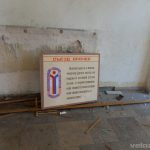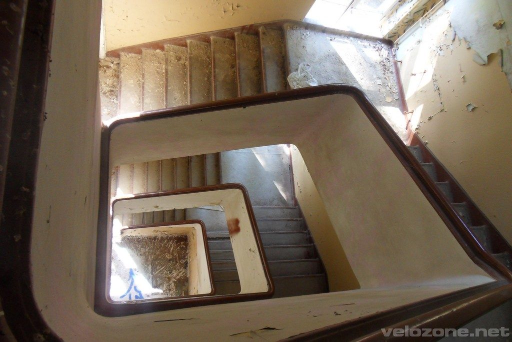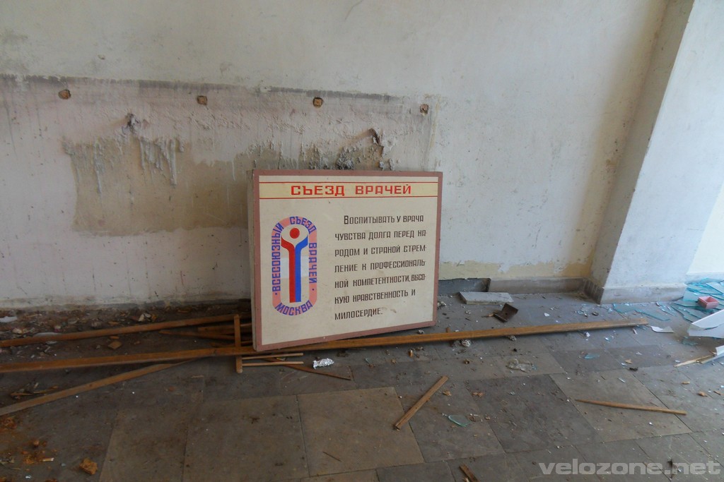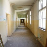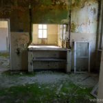 Najpierw główny budynek. Gigantyczny obiekt z niezliczoną liczbą sal, w których jeszcze pozostały lampy operacyjne i inne elementy wyposażenia szpitalnego. Wzdłuż całego budynku przebiega długi korytarz, który przypomina ten z Woronicza znany choćby z „Człowieka z Marmuru”. Ma lekko ponad 200 metrów długości! Na jednym z parapetów znajduję pustą butelkę po gruzińskiej wodzie mineralnej „Borzomi” 🙂 Szyb windy… bez windy. Niestety, bandyci zwani złomiarzami dobrze się obłowili okradając te budynki.