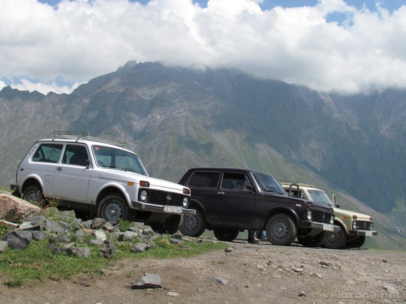 Ostatni dzień, który muszę zagospodarować przed przyjazdem Andrzeja. Niestety na Vardzię za mało czasu, dlatego decyduję się na dość ryzykowną wycieczkę do miejscowości Stepancminda, szerzej znanej jako Kazbegi. Ryzykowną dlatego, że marszrutka jedzie w jedną stronę 3 godziny, zatem licząc z powrotem zostaje mi niewiele czasu biorąc pod uwagę, że chciałbym się wdrapać do kościółka Cminda Sameba. Decyduję się jednak, ale jeszcze przed wyjazdem muszę dokonać Mission Impossible czyli zakupu biletów na nocny pociąg do Batumi. Po dojściu na dworzec czuję się jak analfabeta, gdyż na całym dworcu nie ma ani jednego rozkładu w języku innym niż gruziński. Na szczęście, po krótkim rekonesansie udaje mi się znaleźć kasę w której zostałem obsłużony w języku angielskim. Niestety biletów na wagon sypialny już nie ma, ale udaje mi się dostać bilety siedzące na pociąg o 2:00. Z dworca udaję się na dworzec Didube. Wsiadam do marszrutki wiodącej do Kazbegi. Siedzę sobie wygodnie jakieś…. 3 minuty, po czym zostaję przez kierowcę zaproszony na zewnątrz, i zaprowadzony do innej. Tamta odjeżdża w nieznanym kierunku, a ja czekam jeszcze pół godziny do odjazdu. Ale koniec końców jedziemy. Droga początkowo jest monotonna, ale po godzinie wjeżdżamy w góry. Przejeżdżamy najpierw koło zamku Anauri, po czym droga zaczyna się piąć w górę. To Gruzińska Droga Wojenna, prowadząca aż do Władykaukazu po północnej stronie gór. Przejeżdżamy przez ośrodek narciarski Gudauri, i za tym ośrodkiem… asfalt znika. Kolejne kilka kilometrów aż do przełęczy Krzyżowej to jazda od dziury do dziury z prędkością 20 km/h. Widoki są olśniewające. Po pewnym czasie meldujemy się na przełęczy (2379 m n.p.m). Ciekawostką jest, że podczas jazdy obok drogi są tunele.