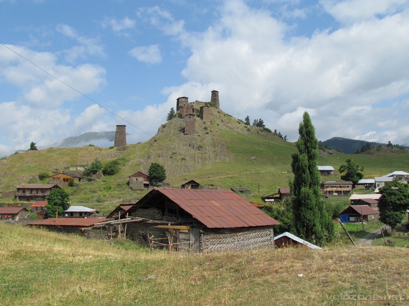 W nocy okazuje się ze kolacja jednak nie była dobra, bo pół nocy spędzam w toalecie. Rano nie jest lepiej, a oprócz mnie jeszcze trzy inne osoby tez cierpią na ból brzucha. Jeszcze mniej przyjemnie robi się przy pożegnaniu, gdy okazuje się ze cena za osobę wzrasta do 25 lari za osobę. Szkoda tylko ze właścicielka twierdzi że powodem jest osobna opłata za namiot i osobna za osobę, podczas gdy jej córka twierdzi ze to przez zjedzone przez nas dwa posiłki. Dziwne te dwie wersje, ale po długich negocjacjach w końcu staje na 20 GEL, ale atmosfera jest nieprzyjemna. W końcu około 10:00 ruszamy z plecakami ostro pod górę. Najpierw dochodzimy do starego Omalo, gdzie zwiedzamy twierdzę (wieże zrekonstruowane również przy udziale rządu Holandii), a następnie idziemy dalej.
