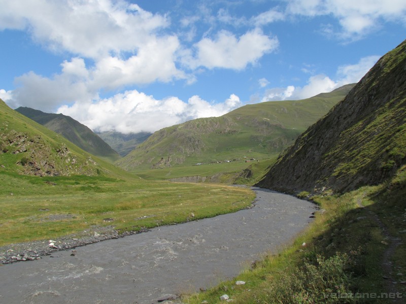 Po wyjściu z Parsmy wygodna droga dla jeepów, którą podążaliśmy od kilku dni zmienia się w wąską ścieżkę. Po kolejnej godzinie marszu dochodzimy do Girevi. Zatrzymujemy się przy jednej z wież na krótki odpoczynek, i nie mija 5 minut, gdy podchodzi do nas chłopiec w wieku kilkunastu lat z prostym pytaniem na ustach: Coffee or tea? My oczywiście na hasło „coffee” uśmiechamy się szeroko, i już za chwilę siedzimy przy zastawionym stole z całą rodziną . Okazuje się że przebywają oni tutaj tylko kilka tygodni na czas wakacji. Wzmocnieni kawą, ruszamy przez wioskę, wspinając się na zbocze wąskiej już doliny Pirikita Alazani. Dopiero z góry widzimy, że w wiosce znajdował się budynek straży granicznej, do którego powinniśmy zajść po zgodę na przejście szlakiem granicznym. Decydujemy się jednak iść dalej licząc na szczęście. Po kolejnej godzinie zaczyna padać.
