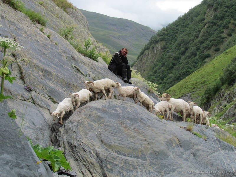 Rano z racji kiepskiej pogody, i powiązanych z tym kłopotami z moim przemakającym i niemal rozpadającym się plecakiem decyduję się na powrót w niziny tą samą drogą, podczas gdy Andrzej zdecydował się iść dalej na Atsuntę. Powracam więc tą samą drogą. Po drodze muszę chwilkę poczekać w trudniejszym przesmyku na ścieżce aż przejdzie tamtędy całe stado owiec. W międzyczasie gawędzę (o ile można nazwać gawędą moją szczątkową znajomość rosyjskiego) z siedzącym pasterzem czekającym na stado. Po krótkiej rozmowie pasterz zza pazuchy wyciąga… nowiutką Nokię z folią na wyświetlaczu i robi mi zdjęcie. Po kilku godzinach marszu na drodze napotykam na stado owiec i siedzącego przy nich groźnie wyglądającego psa. Decyduję się poczekać zatem na idących za mną grupę Kanadyjczyków i Gruzinów. Nadchodzą Gruzini i groźnymi okrzykami przeganiają stado i psa zarazem. Dochodzimy z powrotem do Girevi. Z daleka okrzykami wołają nas żołnierze z widocznego w dole campu. Na dole okazuje się, że mam problem. Żołnierz wypytuje o pozwolenie na przejście. Jest wysoce niezadowolony z moich odpowiedzi, i z braku naszej wizyty dzień wcześniej, jednak po kilkuminutowej wymianie zdań puszcza mnie, decydując jednak, że dalszą drogę mam odbyć z młodym Gruzinem, który planuje iść w tym samym kierunku.