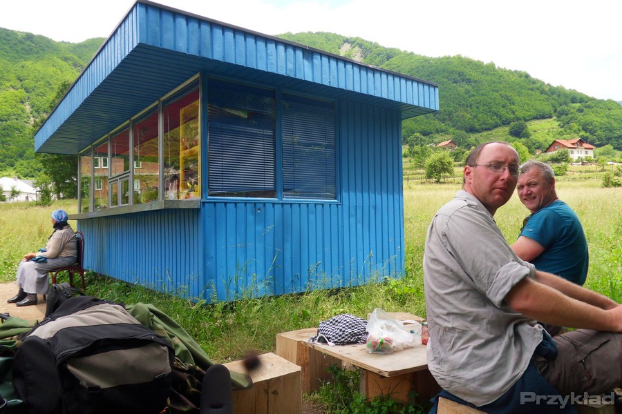 Z racji na to, że mapa wskazuje nam co najmniej kilka kilometrów polną drogą wiodącą w głąb doliny, Andrzej wpada na pomysł, że musimy znaleźć kierowcę, który nas zawiezie do końca drogi bitej. Ale łatwiej powiedzieć, trudniej zrobić! We wsi po pierwsze nie ma żywego ducha, a jak nawet znalazł się w postaci siedemdziesięcioletniej babci, to nie mówi po angielsku. Dopiero po dłuższej chwili pojawia się młoda dziewczyna, która obiecuje coś załatwić. Załatwia. Po kolejnej chwili pojawia się młody człowiek… z plecakiem przygotowanym na górską wycieczkę! Jako że on tak samo rozmawiał po angielsku jak my po serbsku, dłuższą chwilę zajęło nam uzgodnienie stanowisk, że my nie chcemy pieszo w góry, tylko w górę doliny samochodem albo traktorem. Okazało się że Jetmir ma oczywiście taki traktor, ale musi go przywieźć z sąsiedniej doliny, i może nas zawieźć dopiero jutro. Oczywiście w międzyczasie nas zaprasza na swoją kwaterę za jedyne 15 euro od osoby. Po kolejnej chwili negocjujemy jednak, że wolimy nasze namioty, za które zapłacimy jedyne 1 euro od osoby.