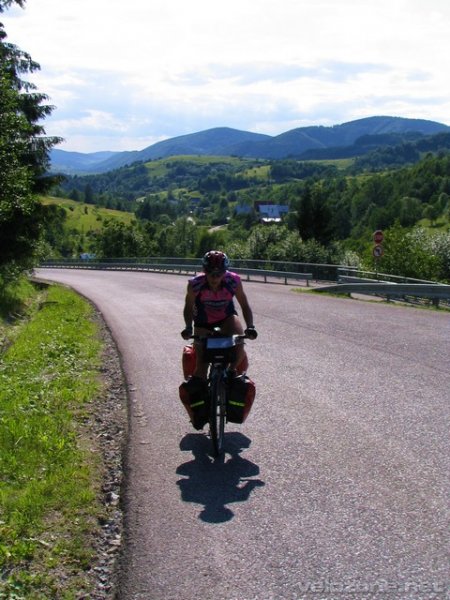 Rano już na szczęście jest ciepło i sucho, nasze ubrania tez. Wyjeżdżamy więc, ale po kilkuset metrach musimy się zatrzymać, bo okazuje się ze koło w rowerze Marka jest nieco krzywo założone. Okazało się, ze hak przerzutki zaczął przekrzywiać kolo, musiało być źle dokręcone. Jedziemy. Po 200 metrach znów postój, tym razem okazało się ze przy poprzedniej naprawie popuściła śruba mocująca linkę przerzutki, należało wyregulować całą tylną przerzutkę. Na szczęście to już koniec przygód, i wspinając się najpierw do Istebnej, a następnie do Jaworzynki zbliżamy się w stronę przejścia granicznego turystycznego w Ciernym. Przejście graniczne przeznaczone jest raczej dla pieszych, mimo iż na mapie poprowadzony jest tamtędy szlak rowerowy – no chyba ze kogoś bawi skakanie po schodach. Po drodze jeszcze zaczepia nas Słowak, który dziwi się ze nie przewozimy alkoholu. Ruszamy drogą w kierunku Svrcinovca i Cadcy. Kilka km za Cadcą skręcamy w boczną drogę, aby ominąć ruchliwe drogi krajowe i dostać się w okolice Terchovej. Dookoła piękne widoki na CHKO Horne Kysuce. Droga wspina się bardzo powoli, by za miejscowością Lutiska osiągnąć pierwsze wzniesienie 700 m. Mimo iż jest to niewielka przełęcz, widoki na przedgórze małej Fatry są bardzo ładne. Na przełęczy w cieni robimy mały popas, kontemplując ilość poprowadzonych szlaków rowerowych. Równie ciekawy choć krótki jest zjazd z przełęczy. Dojeżdżamy do głównej drogi, i kierujemy się w stronę Terchovej. Po drodze uzupełniamy płyny na stacji benzynowej 😉 Przejeżdżamy przez Terchovą która znana jest jako miejsce urodzenia słynnego Juraja Janosika Za Terchovą czeka nas kolejny podjazd na nieco wyższą od poprzedniej przełęcz. Na szczycie jakiś Słowak zwraca się do nas z nietypową prośbą: kręci film o kolarzach i prosi nas, abyśmy przejechali kilka razy polną drogą w kierunku jego kamery. Chyba czaił się tam już chwilę, bo po sfilmowaniu naszej jazdy kręci jeszcze paru innych kolarzy (swoją drogą przełęcz jest bardzo popularna wśród rowerzystów). Zjazd jest bardzo przyjemny, bo trwa niemal do końca dnia (jakieś 25 km).Nie znajdując odpowiedniego miejsca na rozbicie namiotu (park narodowy Wielkiej Fatry) zjeżdżamy aż do Ruzomberoku, gdzie przejeżdżamy przez Wag, aby w podmiejskiej dzielnicy móc rozbić się na łące sympatycznego Słowaka, który specjalnie dla nas wykosił fragment łąki pod namiot. Nasz posiłek wzbudzał zainteresowanie lokalnych kotów, z których dwa chciały nam wejść do sakw i menażek, a jeden siadł obok, i cierpliwie czekał aż oddamy mu jemu należną część 🙂 Nocleg ideał, a 50 metrów od naszego namiotu była linia kolejowa, po której co kilkanaście minut przejeżdżał pociąg 🙂