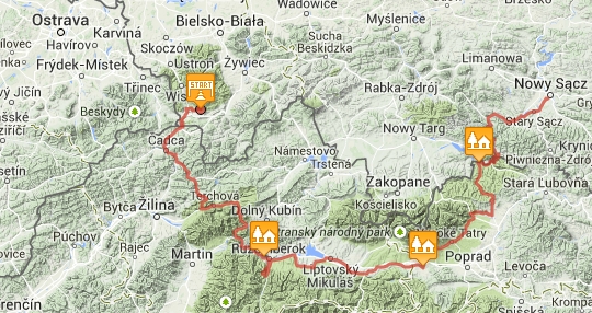 Nasza trasa biegła przez Polskę i Słowację. Z Jaworzynki skierowaliśmy się w stronę Cadcy, stamtąd przez Małą i podnóże Wielkiej Fatry jechaliśmy w kierunku Ruzomberoku i Liptovskieo Mikulasa, podnóżem Tatr, a następnie Tatrzańską drogą wolności jechaliśmy w stronę jaskini Bielskiej, a następnie skierowaliśmy się na przełęcz Magurską. Stamtąd zjechaliśmy do Spisskiej Starej Vsi, i wzdłuż Dunajca dojechaliśmy do Szczawnicy i dalej do Nowego Sącza.