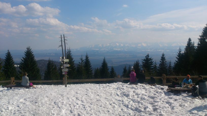 Po posileniu się w jak zwykle gwarnym i zatłoczonym schronisku ruszam z powrotem. Tym razem idzie mi to sporo szybciej, jednak śnieg topnieje w oczach. W jednym miejscu, tam gdzie rano było solidne pół metra śniegu widać strumień, który przebił się w dół na szerokość jednego metra. Po pięciu godzinach od wyruszenia na trasę odpiąłem narty tuż przy samochodzie.