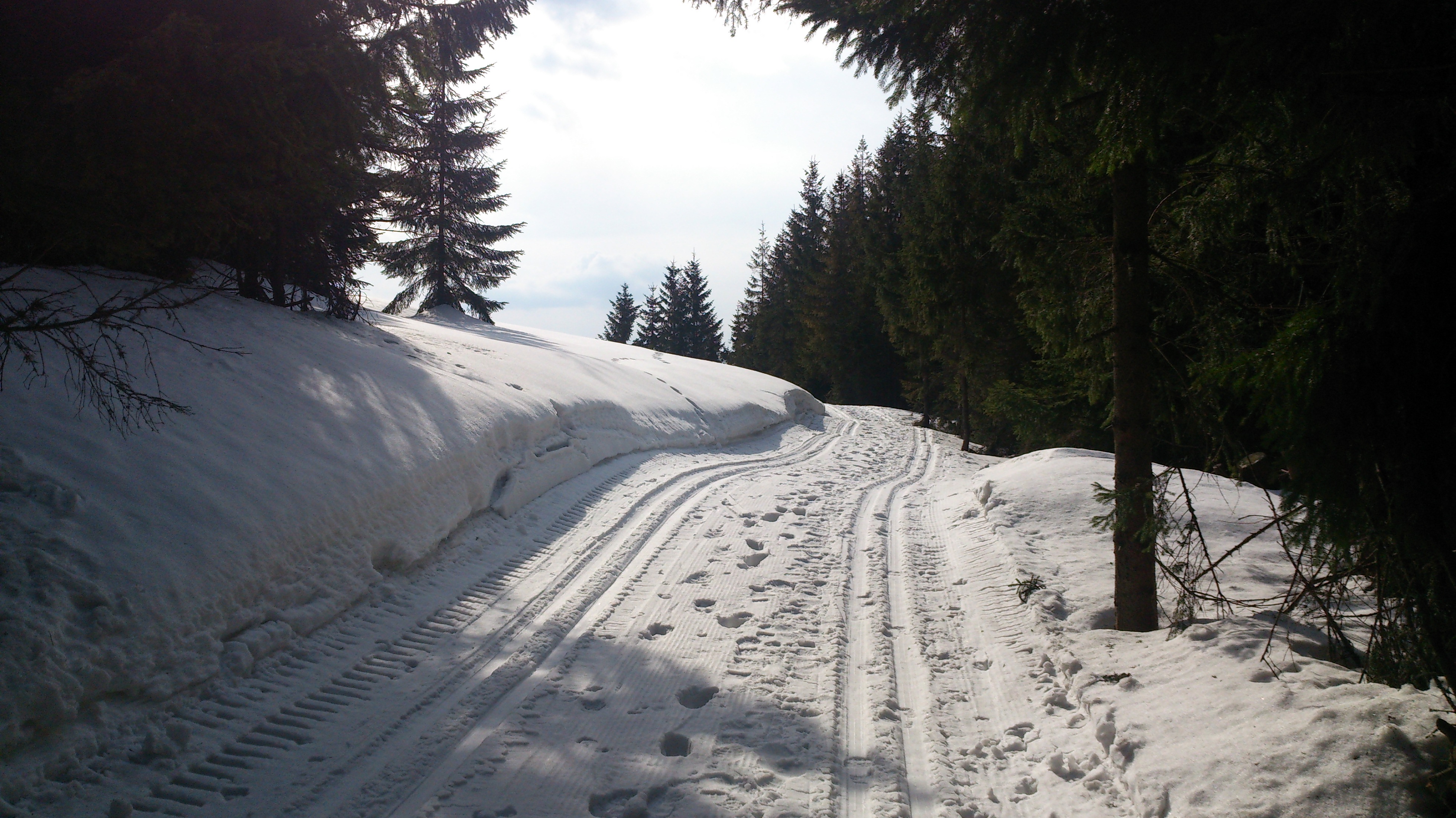 Po kilometrze okazało się, że ze śniegiem nie jest aż tak idealnie, gdyż około kilometr szlaku rozjechany był przez ciężki sprzęt przeznaczony do zrywki drewna, pojawiały się też w bardziej nasłonecznionych miejscach plamy, gdzie śniegu w ogóle nie było. Niemniej jednak, po przejściu około 2 kilometrów trasy pojawił się dobrze wyciśnięty ślad, i zachęcał do jazdy w głąb doliny.