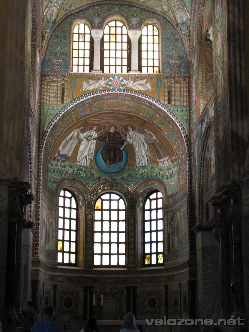 O 5 rano obudziła nas burza. Trochę to było niepokojące, w końcu ok 6:30 mieliśmy wstawać. Wstaliśmy ostatecznie ok 7 i sprawnie w miarę przygotowaliśmy to co było do przygotowania, czyli niewiele. Nawet śniadania nie mieliśmy do zjedzenia. Wyruszyliśmy więc na głodnego w etap do Ravenny. Po 17 km zjedliśmy w końcu śniadanie, bo znaleźliśmy supermarket i kupiliśmy mleko. Nawet cukier znaleźliśmy. Dzień upłynął pod znakiem upałów, mimo iż zaczął się deszczem. Ok 13 wróciła stara włoska pogoda a my smażyliśmy skórę. W połowie dnia minęliśmy Po, tzn. Pad tzn największą włoską rzekę. Etap był płaski więc gnaliśmy przed siebie robiąc dużo km bez przerw. Dojechaliśmy dzięki temu do Ravenny na 17 i zdążyliśmy obejrzeć mozaiki w San Vitale oraz rzutem na taśmę w St. Apollinaire Nuovo.. Udało się sprawnie zwiedzić i już po 19 zaczęliśmy szukać noclegu za miastem. Za pierwszym podejściem dostaliśmy pole pod drzewami. Fajne miejsce bo można było wykąpać, posiedzieć, ale też schować. Niestety po wodę pitną trzeba było jechać ok 1 km do… fontanny.