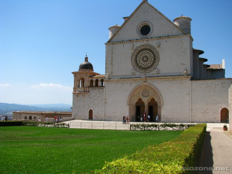 Wstaliśmy ok 5:30, gdyż mieliśmy w planach zrobić więcej kilometrów. Jakimś cudem zwlekliśmy się z karimat i zabraliśmy do porannego rytuału. Okazało się, że było bardzo zimno, a namiot był mokry. Nietypowo jak na tę część wyprawy rano przebieraliśmy się w dresy. Uwinęliśmy się względnie sprawnie i wyjechaliśmy o 7. Niestety za moment mieliśmy przymusowy postój bo trzeba było doprowadzić do pionu szalejącą przerzutkę Marka. Tak szalała, że zapominała przerzucać. W końcu ruszyliśmy dalej bezpośrednio przed jazdą odprawiając modły. Dzień pod znakiem pędzenia do Asyżu. Dojechaliśmy tam ok 11 i trafiliśmy na mszę akurat o 12. Przebraliśmy się ładnie, zostawiliśmy rowery „fra muro, sinistra” i poszliśmy na mszę do Bazyliki Superiori czyli Górnej Bazyliki Św. Franciszka. Po godzinie błogiego spokoju musieliśmy wrócić do codzienności i na słońce, przede wszystkim. Zjedliśmy posiłek i musieliśmy zmienić kolejną dętkę. Tym razem Łukasz, zaraz przed Asyżem, złapał gumę a’la Copperfield bo bez przebijania opony (tak jak Marek wcześniej) – Wyprawa Magików. Zostaję tylko ja, czyli Tomek, ale moje tylne koło jest scentrowane i dobijane ręcznie więc mam nadzieję że to już wystarczy. Potem jeszcze obejrzeliśmy resztę kościołów w Asyżu i pojechaliśmy dalej, w stronę Romy, która zresztą ukazała się na tablicach informacyjnych. W czasie wyjazdu zabraliśmy się na autostradę. Co uświadomili nam dopiero kierowcy na drodze. Na szczęście Polizia Stradale jechała akurat wtedy gdy robiliśmy postój na parkingu. Zjechaliśmy najbliższym zjazdem z autostrady i pojechaliśmy równoległą obskakując wszystko dookoła w poszukiwaniu kompresora lub pompki. A to dlatego, że nasze pompki nie umiały nabić opony Łukasza. Złośliwie przepuszczały powietrze przy dużym ciśnieniu (normalnie tego nie robią). W ten sposób bezskutecznie przelatywaliśmy przez stacje benzynowe, parking przed supermarketem i parking dla camperów. Nocleg znaleźliśmy przy seminarium za zgodą „rektora” czyli młodego szefa seminarium, pewnie również proboszcza tutejszej parafii. Bardzo miły człowiek. Namiot wysechł a my mogliśmy się zanurzyć w bagno, szkoda że zimne 🙂