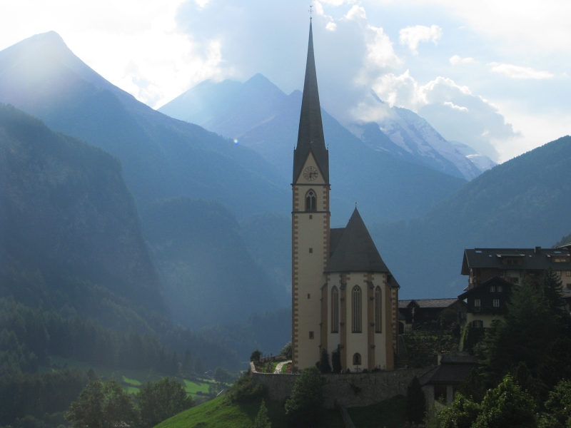 Wraz z kolejnymi kilometrami nachylenie wcale a wcale się nie zmienia, i droga nie daje ani chwili wytchnienia. Za to chmury się podnoszą i widoki, które się odsłaniają są naprawdę nieziemskie. Dostajemy estetyczny rewanż za 2004, kiedy to Taury były niemal w całości schowane za chmurami. Mijają kolejne postoje i kolejne kilometry, i niestety zbliża się nieubłagane… 4kilometry przed Fuscher Torl nagle ściana… Nogi z żelaza, płytki oddech, Marek i Tomek znikają z przodu, a ja zostaję z niemocą. Romantyczny spacer 1,5 km, potem dłuższy odpoczynek. Niestety Tym razem dałem za wygraną – po raz pierwszy Alpy pokazują kto tu naprawdę rządzi. Po odpoczynku na którym zdążyłem rozważyć wszystkie możliwe scenariusze ruszamy jednak dalej, i w stylu mieszanym i lekko rozpaczliwym rozpaczliwym udaje mi się dojechać do pierwszego przewyższenia na trasie jakim jest Fuscher Torl. A jeszcze wczoraj byłem pierwszy do wjeżdżania na Edelweiss – hie hie. Tam zmiana drugiej pary klocków u Marka, test mocowania kamery na kierownicy i niecałe dwa kilometry zjazdu. Dalsza część podjazdu pod właściwą przełęcz Hochtor jest już mniej stroma, więc dojeżdżamy bez większych perturbacji. Klasyczne zdjęcia i ruszamy w dół bo jest już bardzo późno. Zjazd jest świetny, chociaż pogoda nam go nieco urozmaica, najpierw kropiąc deszczem, a potem w Heiligenblut zapiekając nas słońcem. Kilka zdjęć niezwykle malowniczego kościółka z Grossglocknerem w tle, i zjeżdżamy w dół dolina aż do Winklern, gdzie trafiamy na ogródek w wersji de luxe , z duużym wieszakiem na pranie, gdzie możemy wreszcie wysuszyć zawartość sakw.